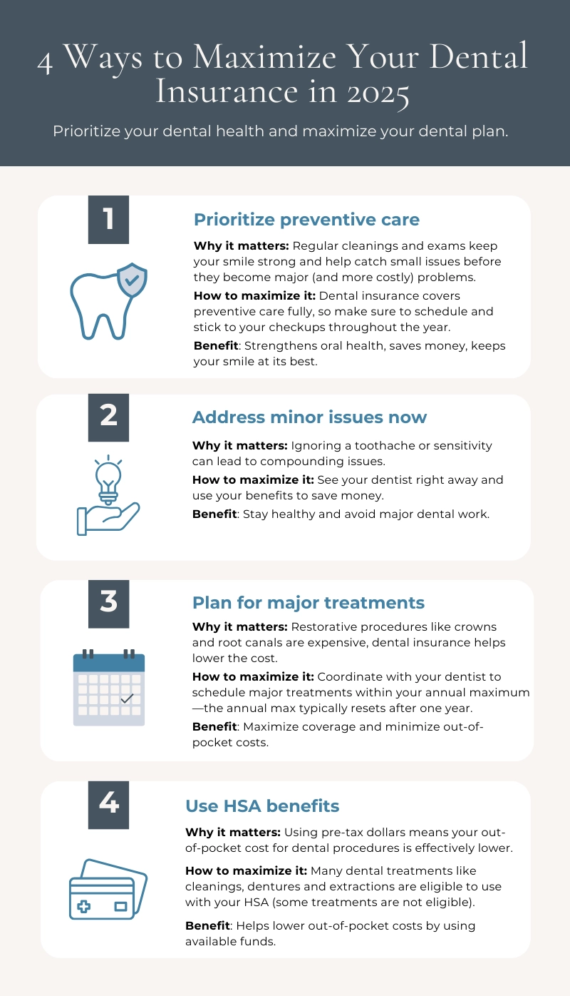 Take full advantage of your dental benefits in 2025. Focus on prevention, plan for treatments and enjoy the peace of mind that comes with a healthy, confident smile